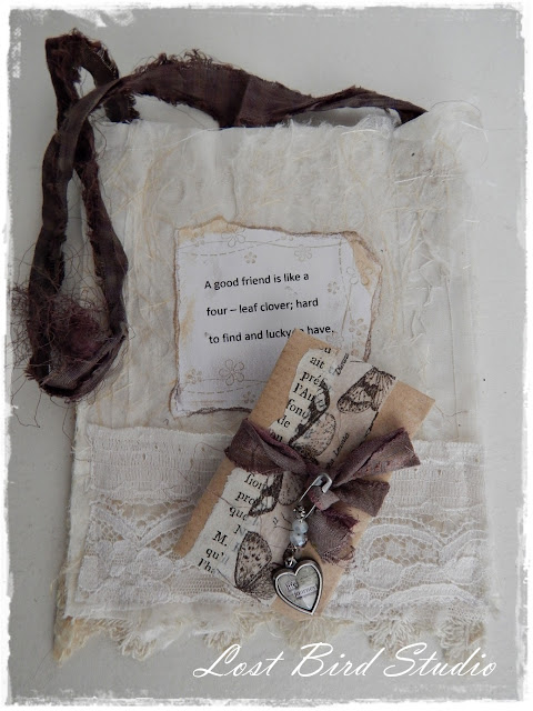 The fabric collage also functions as a gift holder and tucked inside is a small surprise.